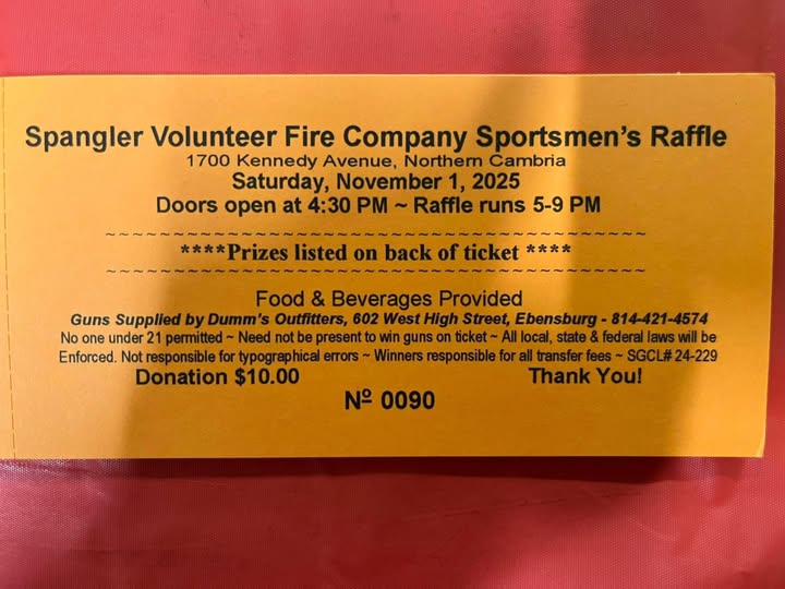 LOW TICKET INVENTORY! our ticket sales have been GREAT for our upcoming fall raffle! With that being said, we are not holding any ticket(s) unless the ticket(s) are purchased. If you’re in need of a ticket(s) please message our page directly or a member of the Spangler Fire Company so arrangements can be made to secure a ticket(s)